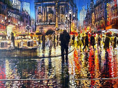Ein weiterer optischer Clou von Mertens: es regnet. Und zwar immer. Von der ersten bis zur letzten Seite findet die Handlung in strömendem Regen und unter einem finsteren Himmel statt (und offenbar im Jahre 1976, da sich François im Kino „Taxi Driver“ anschaut – wobei die Stadt anonym bleibt). Und quasi als Running Gag wird François ständig durchnässt, weil er permanent seinen Regenschirm vergisst. Der Regen, bzw. die regennassen Straßen, aber auch die in der Stadt allgegenwärtigen Leucht- und Neonreklamen sind dann auch in erster Linie die Quelle der überbordenden Farbenpracht, mit der Mertens hier beeindruckt und die der Tristesse der Stadt und des Wetters entgegenwirkt.