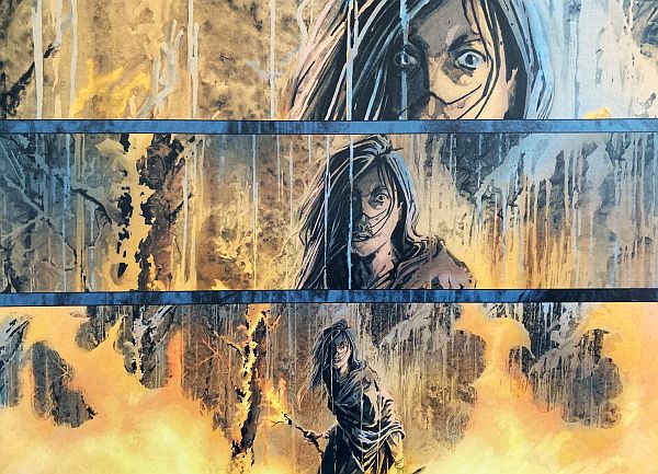 Der Zeichenstil, den Dominique Monféry hier präsentiert, unterscheidet sich teils massiv von seinen Vorbänden, die ebenfalls bei Splitter (bzw. toonfish) erschienen: Sowohl der Zweiteiler „Tin Lizzie“ als auch der One-Shot „Evil Road“ kamen, was Figuren und Gesichter betrifft, mit funny-artigen Zügen daher, wobei „Evil Road“ auch konventioneller gestaltet war, hinsichtlich Einsatz von Tusche und Farben. „Ein unerwarteter Todesfall“ (eigentlich müsste der Titel im Plural stehen) ist in jeder Beziehung realistisch gezeichnet. Eindringliche, atmosphärisch dicht gestaltete, fast gemalt erscheinende Bilder, die an den Stil von Guillaume Sorel erinnern, prägen den Band, der mit seinen gediegenen Farben gleichermaßen die Schönheit und den Schrecken der Winterlandschaften zeigt, oft filmisch inszeniert, mit einem zusätzlichen Kontrast aus Schnee, Finsternis und Feuer (siehe oben). Worte entfallen, wo sie nicht benötigt werden. Dann lässt Monféry nur die Bilder sprechen. Und das macht er vorzüglich. (bw)
