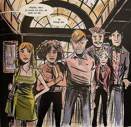 So entspinnt und entwickelt sich ein Krimi. Und zwar einer der alten Schule. Keine Action, keine Thriller-Elemente irgendwelcher Art (Matt Kindts „Dept. H“, ebenfalls bei Skinless Crow erschienen, ist ja auch ein Krimi, nur eben ganz anders gestrickt und mit eben solchen Motiven). Nur zwei aufmerksame Hobby-Ermittler, dazu ein cleverer Inspektor, der eine gehörige Portion Arroganz mitbringt. Und in bester Agatha Christie Manier ein hermetischer Kreis an Verdächtigen aus einer Familie, die ihr beträchtliches Vermögen mit zweifelhaften Geschäften gemacht hat.