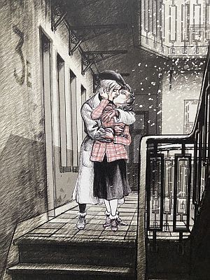 Interessant auch der Ort und die Zeit, in der die Geschichte spielt. Denn beides ist nämlich unbestimmt und auch (absichtlich) nicht final ergründbar (auch hier im Comic nicht). Es gab wohl Krieg. Gleich im ersten Panel sehen wir zerstörte Häuser und ein Flugzeugwrack, später auch einen offenbar demolierten Panzer. Die Stadt wird von einer natürlich verhassten Besatzungsmacht kontrolliert. Alles sieht aus wie eine französische oder belgische Stadt im Zweiten Weltkrieg, besetzt von den Deutschen. Auch prangt eine Art Judenstern auf Franks Jacke. Wären da nicht die fremdsprachigen Schilder, die an Osteuropa erinnern oder Autos, die dort hergestellt wurden. Auch die Uniformen und Helme passen nicht zur Wehrmacht, wie auch die Symbolik (keine Hakenkreuze). Simenon lässt also bewusst Ort und Zeit als Allgemeinplatz offen.