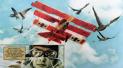 Wie in den Vorbänden holen die Zeichnungen von Carlos Puerta die Kohlen aus dem Feuer. Die bewegen sich wieder ganz nahe am Fotorealismus, erinnern an zeitgenössische Fotografien (auch durch die Farben!) und erstecken sich oft randlos über die ganze Seite. Puerta tobt sich hier so richtig aus: natürlich stehen an erster Stelle die furios inszenierten Luftkämpfe, mit dem Baron im Mittelpunkt – sei es gegen Feind oder Freund. Aber auch anderes altertümliches Kriegsgerät wird beeindruckend in die Geschichte eingebunden und präsentiert, zu Lande, zu Wasser und wieder in der Luft: die ersten britischen Tanks (Mark I), monströs behäbige Vehikel, die auf den Schlachtfeldern an der Somme zum Einsatz kamen, ein britisches U-Boot, das zur leichten Beute wird und sogar ein deutscher Zeppelin, diesmal ein sicheres Ziel für die Briten. Inzwischen fliegt Manfred von Richthofen auch den Flugzeugtyp, der ihn berühmt machte (und umgekehrt): den knallroten Dreidecker, die Fokker DR. I. Optisch ist der Band eine „Granate“, noch mehr als seine Vorgänger. Und mehr Seiten hat er auch. Laut Panini ist die Serie damit abgeschlossen. Das Ende bleibt aber seltsam offen und damit eher unbefriedigend. Vielleicht kommt ja doch noch was… (bw)