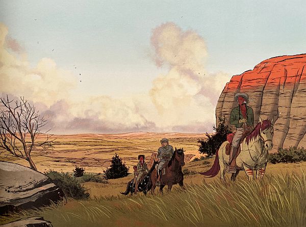 Als die Situation schließlich und wie erwartet eskaliert, entdecken die drei den flüchtenden George, bringen ihn aber nicht um, sondern nehmen ihn einfach mit. Bald macht es sich Little Knife zur Aufgabe, die verlorene indianische Seele und Identität des entwurzelten Jungen wieder zum Vorschein zu bringen, und damit sein Bewusstsein für Lakota-Traditionen – ein Motiv, das sich durch weite Teile des Bandes zieht. Bis die drei – jetzt vier – ihr Ziel, eine Bergbaustadt im Norden, wo Little Knifes Erzeuger leben soll, erreichen, verfolgen wir einen Roadtrip (freilich weniger auf Straßen als durch die Wildnis) mit diversen Begegnungen, die in der Regel tragisch und/oder blutig enden, bei denen die Weißen wahrlich keine gute Figur zeigen. Erlebnisse, die aus George vielleicht einen anderen Menschen machen, ihn aber auf jeden Fall zutiefst prägen werden. Außerdem haben die vier einen hartnäckigen, gnadenlosen Verfolger, der nicht locker lässt und ihnen immer weiter auf den Fersen ist…