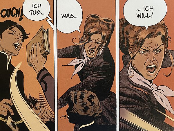 Nach der Eskalation am Ende des letzten Bandes, samt famosem Cliffhanger, wechselt nun erst einmal die Perspektive. Und die Zeit. Wir verfolgen eine Rückblende im Breitwandformat und springen darin mitten in den amerikanischen Sezessionskrieg. Dort sehen wir Madeleine Esther „Sister“ Oz, wie sie auf Seiten der Südstaaten nach einer vermeintlich verlorenen Schlacht mutig und trotzig die Fahne schwenkt und dabei patriotische Lieder anstimmt. Was gleichzeitig die „Origin“ von Sister Oz markiert (auf eine weitere, für ihren Werdegang entscheidende Episode, wird später noch einmal Bezug genommen). Erst danach wird besagter Cliffhanger spannend aufgelöst und die Story kann weiter gehen.