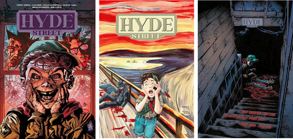 Verantwortlich für die Reihe ist das Ghost Machine Studio, das so illustre Namen wie Gary Frank, Bryan Hitch oder Jason Fabok vereint. Wie auch DC-Veteran Geoff Johns und Ivan Reis, der bereits in seiner Karriere als „Lady Death“ Zeichner Horror-Erfahrungen sammeln konnte und der hier Bilder präsentiert, die rundum beeindrucken. Seine Zeichnungen, im Verbund mit Inker Danny Miki, sind äußerst aufwändig, kräftig und stecken voller Details – so ist schon das Cover eine Hommage an ein Gemälde von Norman Rockwell (The Runaway, 1958). Francis Portela, der die Kapitel fünf und sechs zeichnerisch verantwortet, kommt da nicht ganz ran. Vom ersten Band gibt, bzw. gab es drei Hardcover-Varianten, die bereits vergriffen sind (Cover siehe ganz unten). Und auch die reguläre Softcover Ausgabe ist vielerorts bereits ausverkauft. Hier sollte man sich also ranhalten, um noch ein Exemplar zu ergattern. (bw)